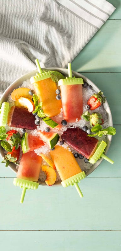 Soaring summer temps can have us running for frozen treats to cool off. But icy treats tend to be the purview of the kiddos. The flavours of most ice pops tend to be geared towards younger taste buds – think super sweet, highly coloured novelties. But grown-ups need a way to cool off too and don’t always have a taste for the crazy confections kids do. Here we have made three ice pop flavours meant for a more mature palate: berry kombucha, peach ginger, and watermelon lime. Super simple to make – just blend and freeze.