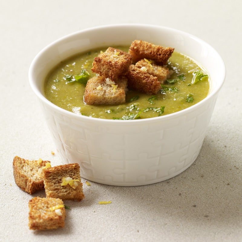 Creamy Asparagus-Leek Soup with Homemade Croutons