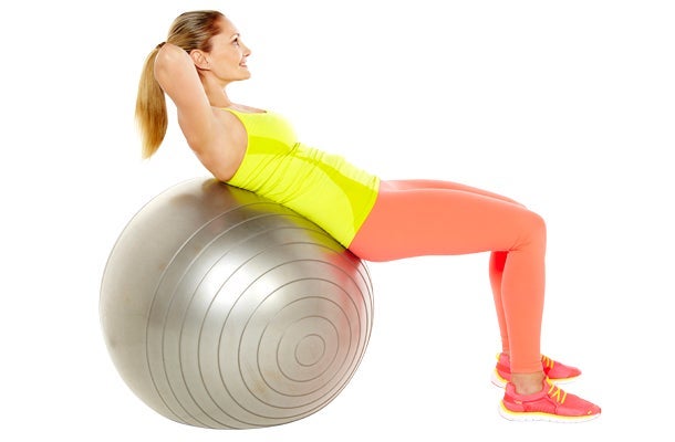 How-to: Sit on the edge of an exercise ball with your feet placed firmly flat on the floor, hip-width apart. Support the back of your head with your hands and lower your body so your lower back is supported by the ball. Engage your abdominal muscles as you lift and lower your shoulder blades to a 45-degree angle. Exhale as you lift up and inhale as you lower. Repeat.