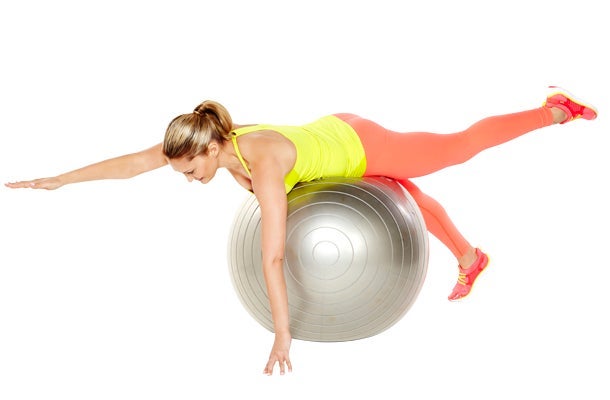 How-to: Lie with your stomach across the ball and your hands and feet touching the floor. Raise one arm in front of you to shoulder height and the opposite leg behind you to hip height. Hold and then lower the arm and leg back to the floor. Repeat with the other arm and leg and continue alternating.
