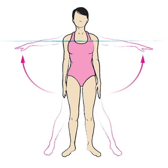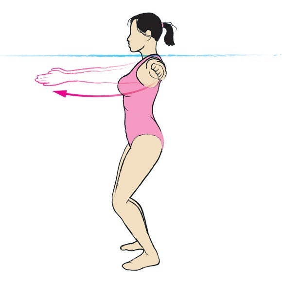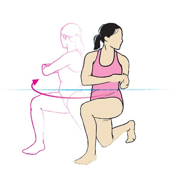 Technique: Start in a split lunge position, with your right leg forward and foot flat on the bottom of the pool, and your left leg behind you up on your toe. Tuck elbows into your sides with your lower arms at 90º and hands flat together so your fingers point ahead. Jump and swap legs so your left leg is forward and rotate your upper body so that your hands are pointing to the left, then jump and swap again so your right foot is forward and your hands and upper body are facing to the right. See how many you can do in 40 seconds.