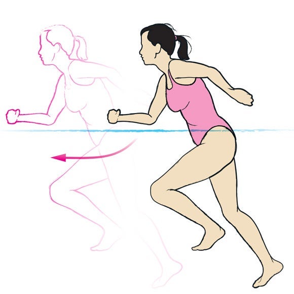 Technique: Start standing tall in waist-deep water, then lean forwards and run as fast as you can with short steps for 40 seconds. If the water gets too deep, turn around and keep going back to where you started. The main thing is that you are working hard for 40 seconds, so don’t worry about slight changes in water depth.
