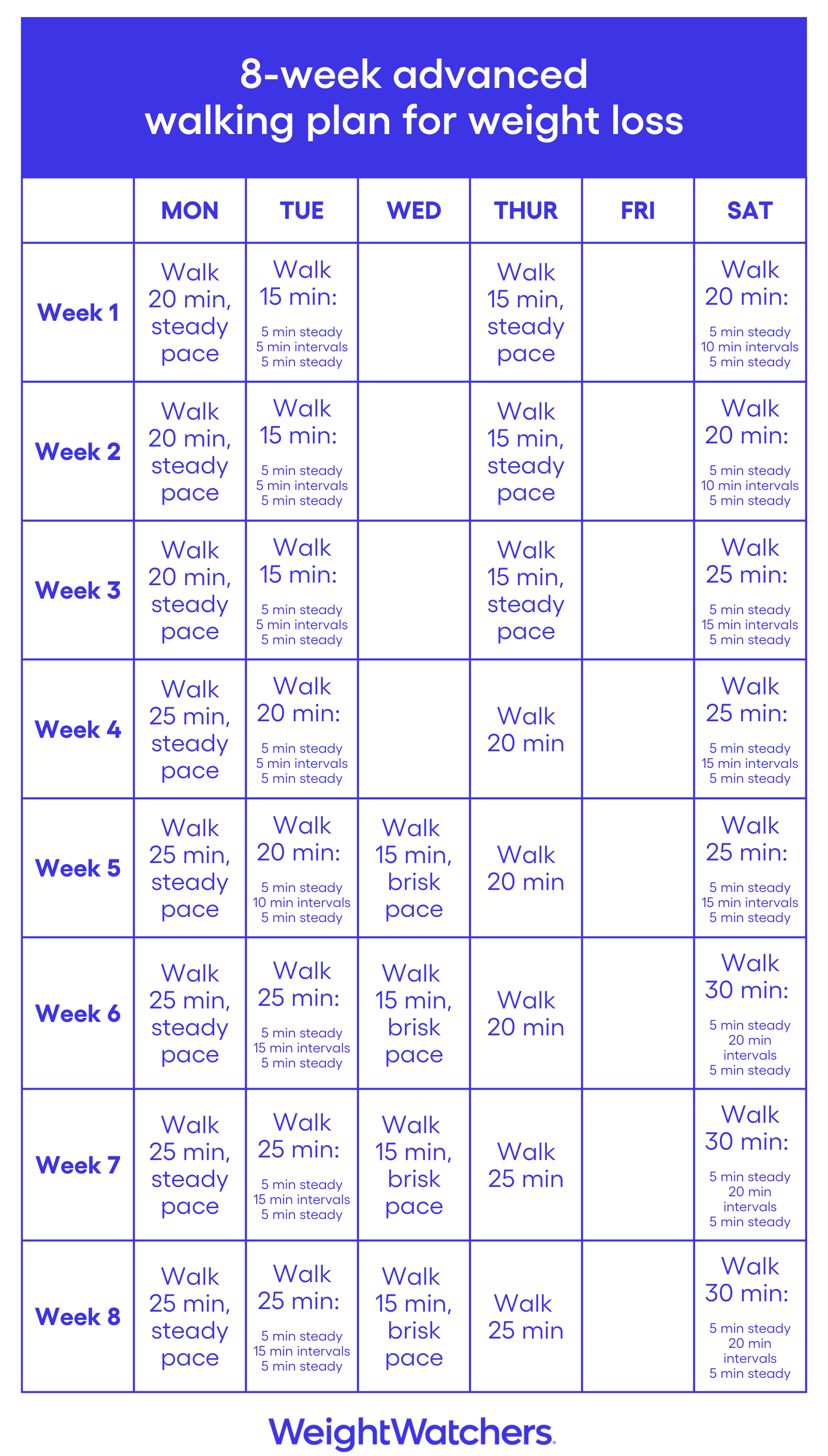 Perhaps you walk up to 30 minutes at a time most days of the week, sometimes longer. If you've been mobile for at least two months and feel ready to take your walking to the next level, you can jump in here — or follow the Walk Farther program — and build on your base. For the intervals, alternate between equal time (1:1 ratio) of a fast pace and a slow/recovery pace. (For example: Walk as fast as possible for 30 seconds, then slow to a recovery pace for 30 seconds.)