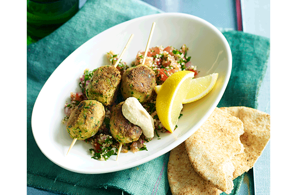 Falafel skewers with hummus and tabouli>