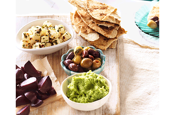 Mezze plates are popular in many Mediterranean and Middle Eastern countries. The platter is made up of many small plates designed for sharing. These dishes vary by region but common dishes include; falafels, dips like baba ganoush and hummus, labne (thick strained yoghurt), tabouli, olives, veggies and pita bread. The best thing about making your own mezze plate is you can mix and match the dishes you like. Choose your favourite breads, veggies, dips and spreads, salads, cheese and meats to create your perfect mezze. They also make a terrific entertaining plate to serve.