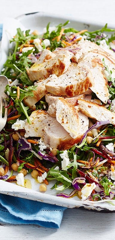Expert idea: Make your own hummus by blending 1 x 400g can of chickpeas, 1 tablespoon of lemon juice, 1 crushed clove of garlic, and 1 tablespoon of tahini (serves 8). Serve with wholemeal pita pockets filled with sliced cucumber, sliced tomato and shredded skinless barbecued chicken breast.
