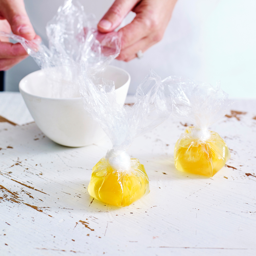 Gather ends of plastic to enclose egg, being sure to expel all the air. Twist firmly just above the egg, then tie securely. Repeat with remaining eggs.