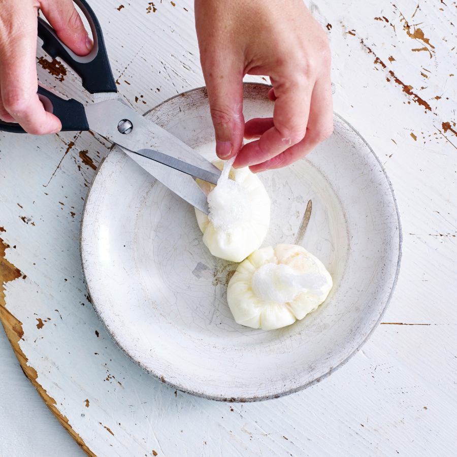 Use scissors to snip plastic between egg and knot. Carefully peel away plastic. Turn eggs onto toast and sprinkle with chives. Season.