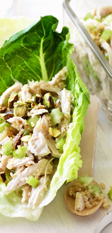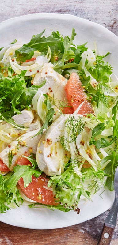- 125g chicken breast fillets: poach 5 minutes. Turn off heat and set aside, covered, for 5 minutes. Should feel firm when pressed with tongs.