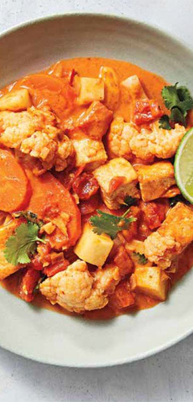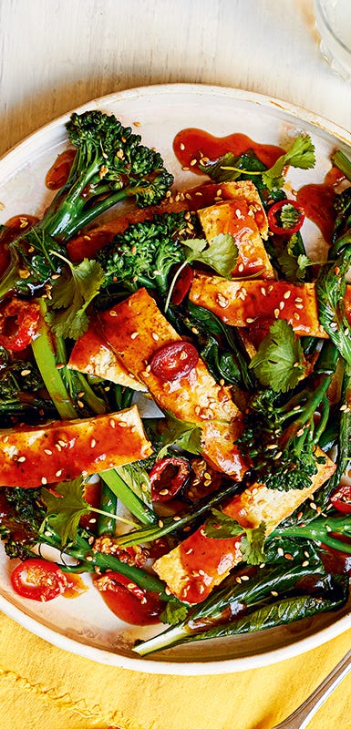 Treat firm or extra-firm tofu like chicken breast in just about any recipe. In a stir-fry, sear tofu in a wok to create a crust, then remove and add veggies. When the veggies are cooked, add the tofu back in with your sauce and mix. You can also cover tofu in sauce and bake it in the oven with veggies, or cube it and air-fry it with seasoning or marinade. “Once it’s in the frying pan, it’s ready in 5 to 6 minutes,” Caspero says.