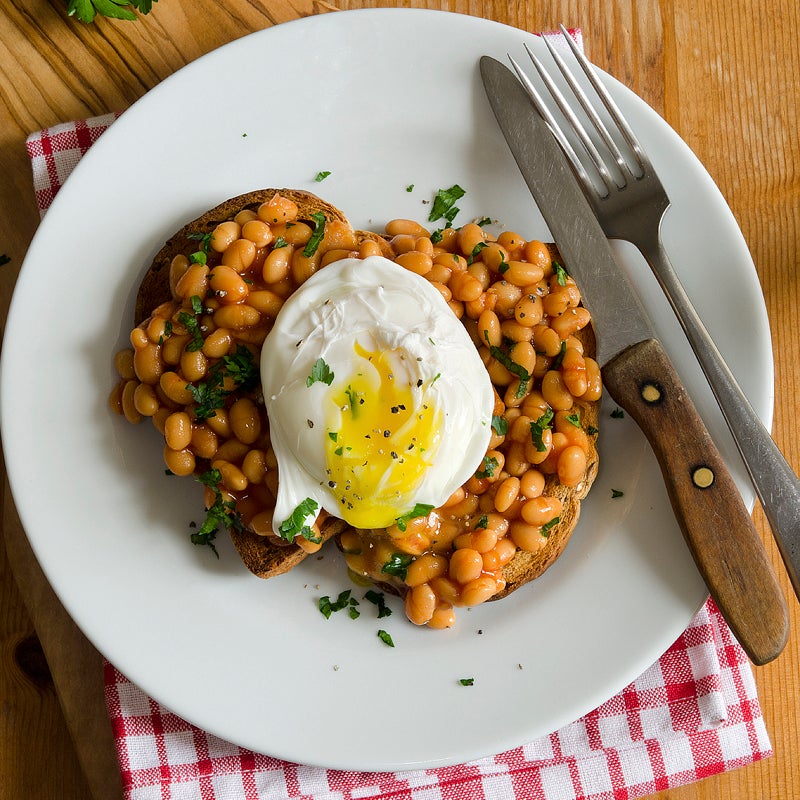 Heat 140g baked beans in tomato sauce and serve with 1 slice (35g) wholegrain toast and 1 medium poached egg along with 1 kiwi.