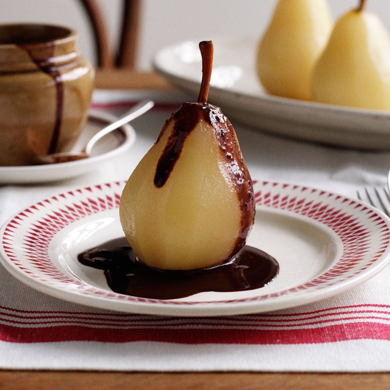 Heat a small saucepan filled with water over medium-high heat. Add 1 fresh pear (peeled) and bring to the boil. Reduce heat and simmer for 10 minutes until tender. Drain. Meanwhile, melt 20g dark chocolate chips in the microwave, heating in short bursts to avoid burning. Place pear upright on a serving plate and drizzle melted chocolate over the top.