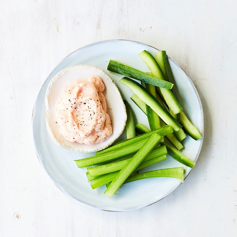 Serve cucumber and celery sticks with taramasalata, seasoned with pepper.