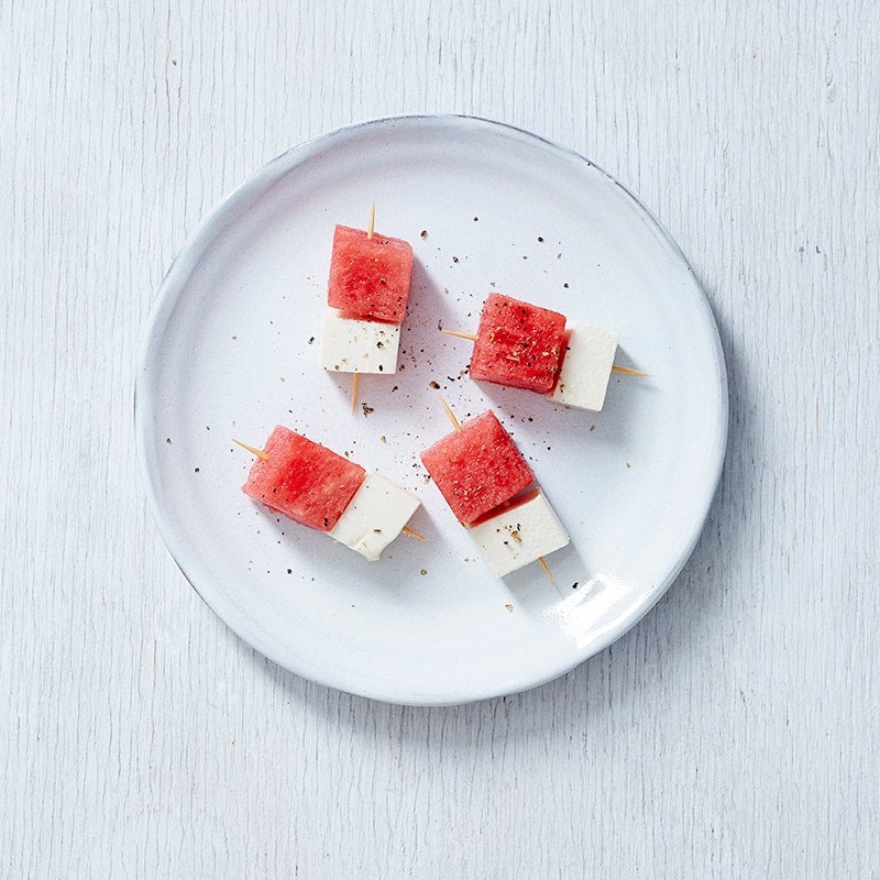 Skewer watermelon cubes and feta cubes onto 4 toothpicks. Sprinkle with pepper.