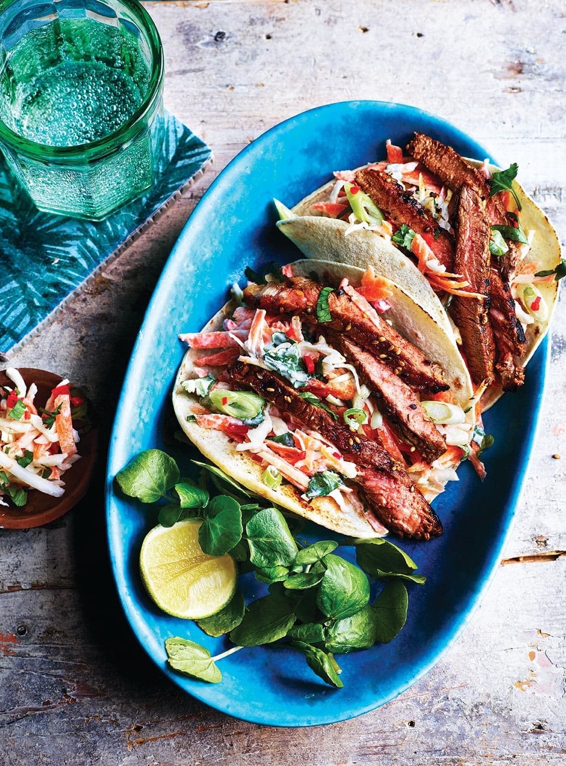 Warm the tortillas according to packet instructions. Spoon slaw over tortillas. Top with the steak and serve with lime wedges and any leftover slaw on the side.