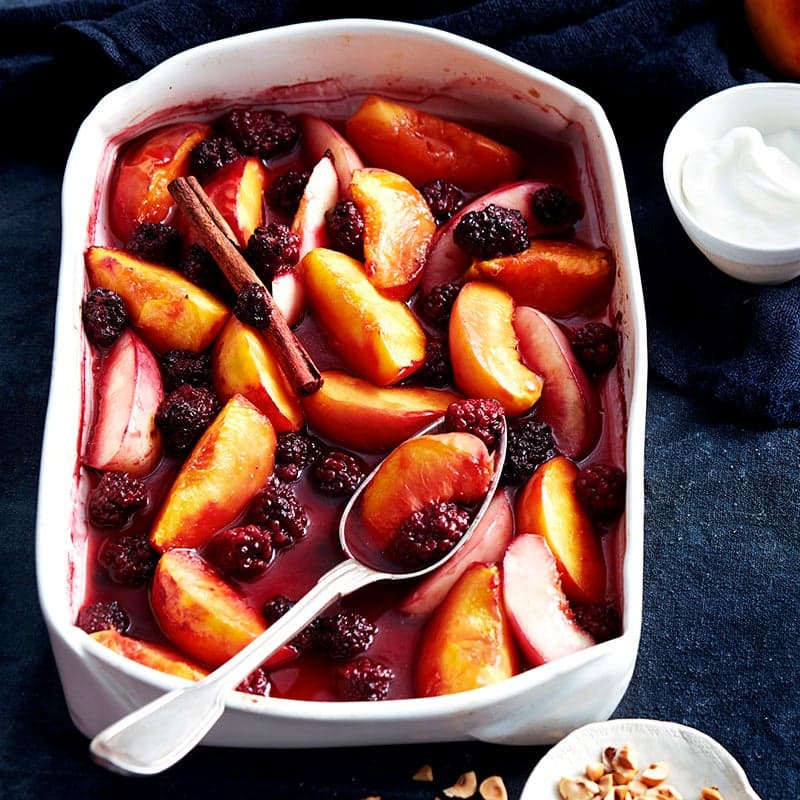 Arrange peach, nectarine and cinnamon in a shallow ovenproof dish. Drizzle with vanilla and ⅓ cup (80ml) water. Bake, covered, for 15–20 minutes or until fruit begins to soften. Uncover and add blackberries. Bake for 15 minutes or until fruit is soft and liquid has reduced. Serve sprinkled with hazelnuts.