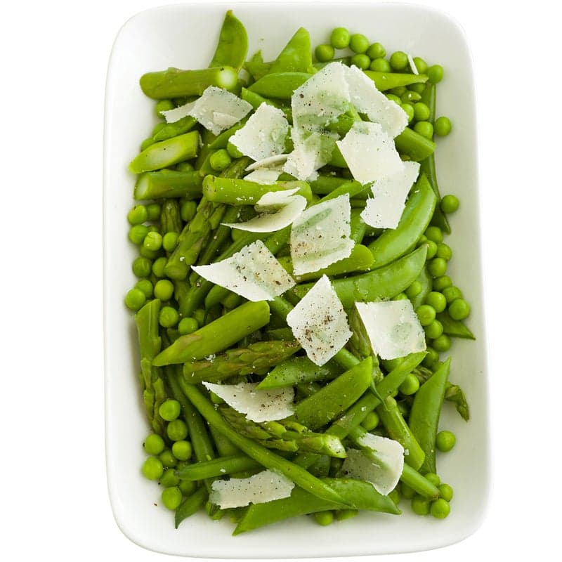 Boil, steam or microwave asparagus, green beans, sugar snap peas and peas, separately, until just tender. Rinse under cold water. Drain. Place vegetables in a serving bowl and drizzle with lemon juice and olive oil. Toss to combine.
