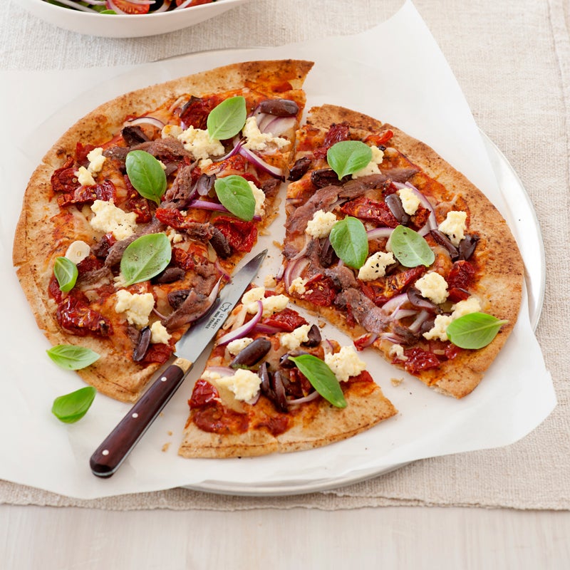 A healthy gourmet pizza topped with intense flavours of olives, sundried tomatoes, and ricotta.