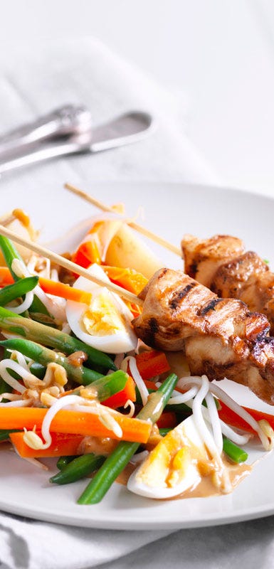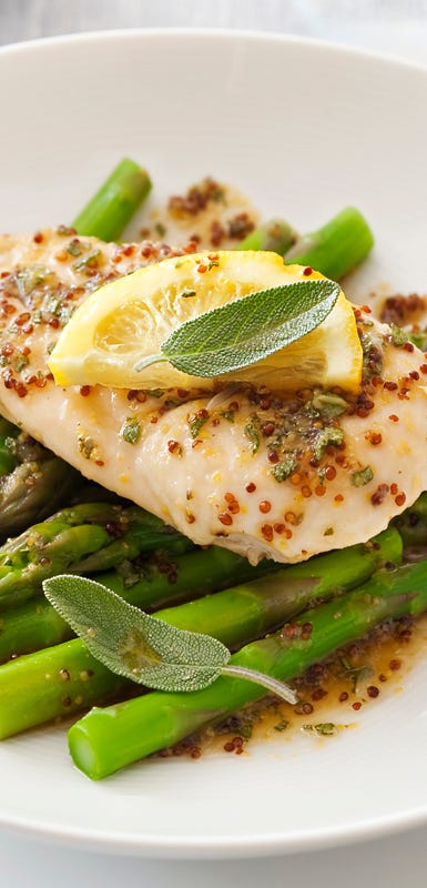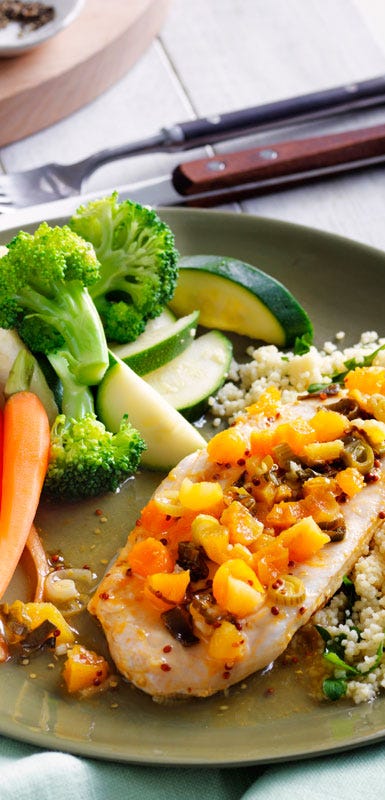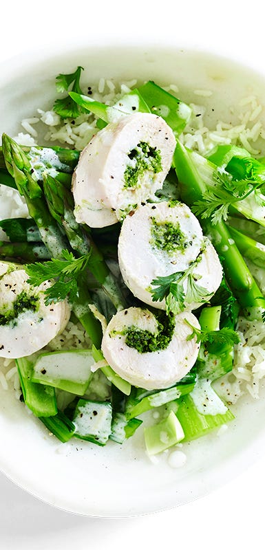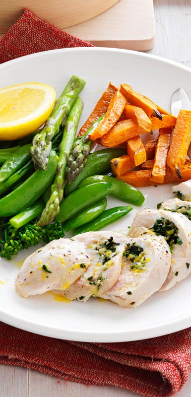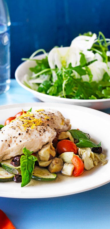 Slice skinless chicken breast into thin strips and steam them with your favourite vegetables and an aromatic herb. For an Asian twist, try snow peas, shiitake mushrooms and crushed lemongrass. Discard the lemongrass before serving and sprinkle with fresh coriander.