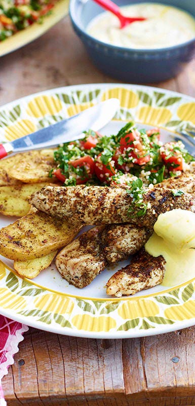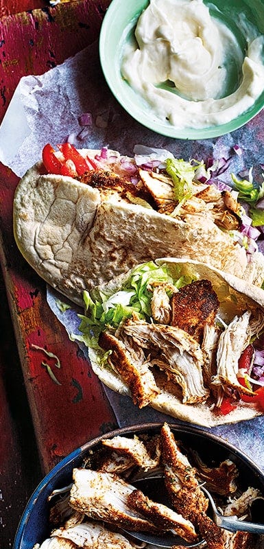 Cut the chicken into 3 cm cubes then slide them onto metal skewers or pre-soaked wooden skewers. Add your vegetables of choice: Onion wedges, green capsicum cubes or quartered yellow squash. Brush chicken with a marinade made from 1 tablespoon olive oil and 1 tablespoon sumac. Grill or pan-fry the skewers for 15-20 minutes or until golden and cooked through. Squeeze with a little lemon juice and sprinkle with chopped coriander or parsley.