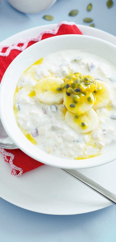 To start, grab a jar or container and add some old-fashioned rolled oats. Add in your choice of liquid, like milk, to soften the oats. The more liquid you add, the thinner the oats will be. If you like a creamier texture, add some 99% fat-free plain yoghurt. Now for the fun part, you can customise overnight oats to your heart's content. Cover, and leave in the refrigerator to 'cook' overnight.