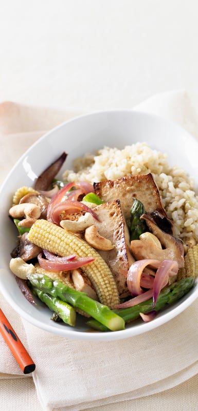 Vegetarian night has never been so delish! Yummy stir-fried tofu rice paper rolls, fried rice with loads of veggies and almonds and tofu stir fry with fresh ginger, shiitake mushrooms and cashews.