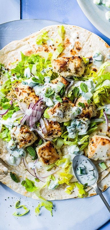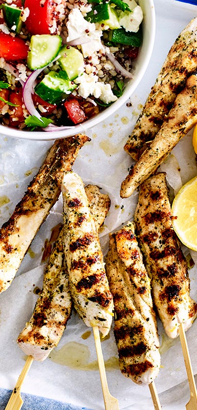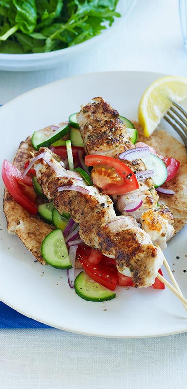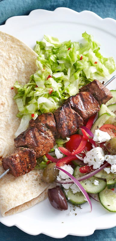 - Souvlaki. Souvlaki literally refers to anything on a skewer, but is most often meat served for eating with pita, with vegetables as an occasional addition. Grilling is the best choice for meats, and these simple, lean cuts of chicken, lamb, or pork are pure protein on a stick. They come served with pita and tzatziki — a dipping sauce made from Greek yoghurt, cucumber and garlic.
