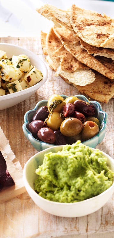 - Mezze (meze). A selection of small dishes served as appetisers in both Middle Eastern and Mediterranean regions. Dips like hummus and tzatziki, warmed pita bread, dolmades (stuffed vine leaves), cheese like feta and haloumi and Kalamata olives are often found on Greek meze plates.