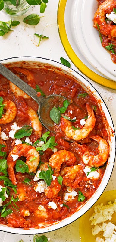 - Prawn saganaki. Sautéed prawn are baked in the oven with tomatoes and feta in this relatively healthy restaurant favourite.