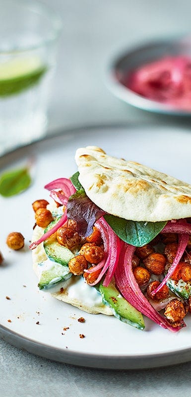 - Hummus and pita. Chickpeas are a great source of vegetarian protein, and you’ll sometimes see flavourful additions of garlic and sun-dried tomato, but you need to watch portions with this one.