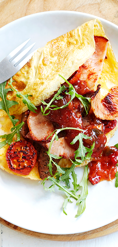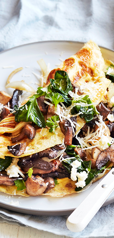 Tip: Use up leftover roasted vegetables or cut up pizza topping ingredients in an omelette. Spinach, mushrooms, olives, ham, artichokes, capsicums and broccoli all work well in omelettes.