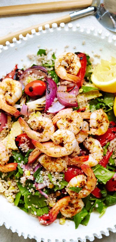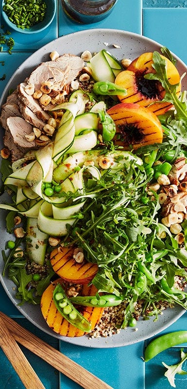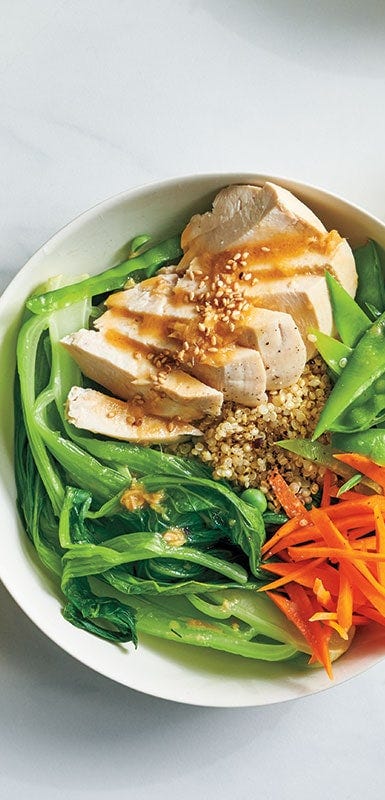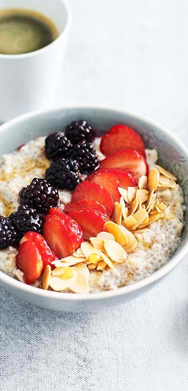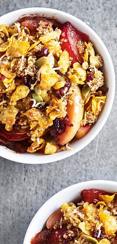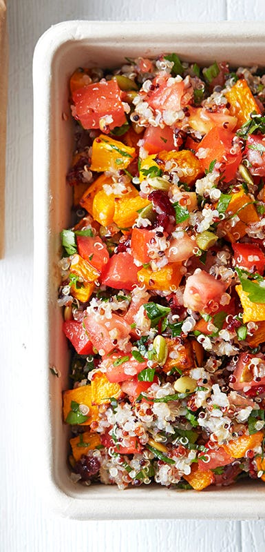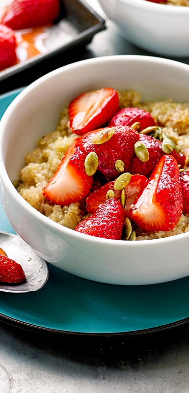 - Begin your day with quinoa porridge: Bring ⅓ cup of quinoa and ⅓ cup of water to a boil in a small saucepan. Simmer covered for 10 minutes, then add ⅓ cup skim milk and continue simmering covered for another 10 minutes or until thickened. Serve with fresh or dried fruit, nuts, and a touch of honey if desired.