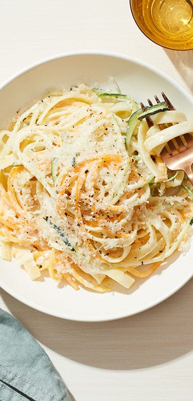 4. Swap half the amount of dry pasta for spiralised veggies like carrot and zucchini for an extra serve of veggies. If you don't have a spiraliser you can use a vegetable peeler to peel zucchini into ribbons or buy pre-cut spiralised zucchini in the fresh produce section of most supermarkets.