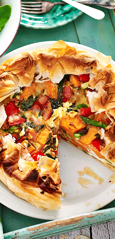 One of our favourites from this dinner plan is our deep dish bacon and vegetable tart. It's chock-full of fresh spring vegetables, cheesy goodness and layers of golden filo pastry making it a guaranteed crowd pleaser.