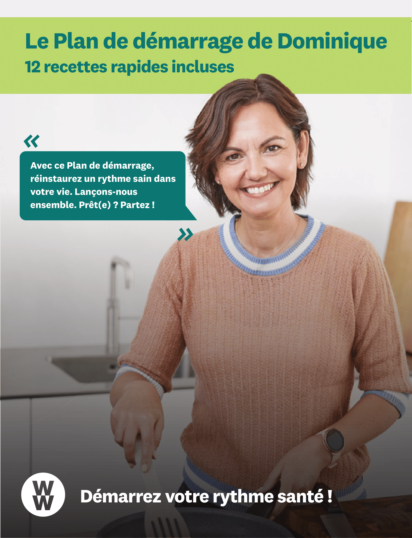 Paré(e) pour reprendre un rythme plus sain ? Pour vous aider à établir votre propre menu hebdomadaire, Dominique Monami, Ambassadrice WW, partage avec vous ses 12 recettes rapides préférées. Vous envisagez de renfiler votre tenue de sport ? Alors son programme d’activités devrait vous fournir de l’inspiration. Cliquez sur l'image ci-dessous pour consulter le Plan de démarrage de Dominique Monami !