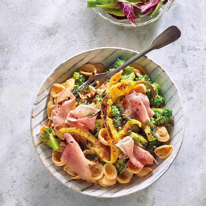 Battez les œufs, le parmesan, le piment chili, le thym, du sel et du poivre. Égouttez les pâtes, en récoltant 100 ml de jus de cuisson. Versez-le avec les pâtes sur les brocolis, retirez la poêle du feu et mélangez-y les œufs en remuant. Garnissez de morceaux de jambon de Parme et servez.