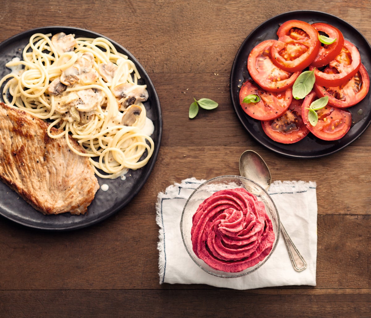 Mettre dans un blinder les deux carrés frais. Ajouter les framboises et les glaçons de yaourt. Mixer le tout pour obtenir une superbe glace crémeuse. Servir la crème glacée à l’aide d’une poche à douille cannelée. Délicieux avec n’importe quel autre fruit.