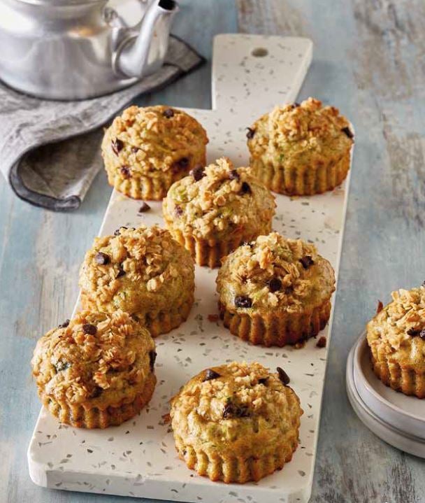 Dans un saladier, battre énergiquement les oeufs avec le sucre roux. Ajouter le yaourt, la moitié des flocons d’avoine puis les courgettes râpées et bien mélanger. Incorporer enfin la farine avec la levure et les pépites de chocolat. Verser dans les moules (position muffin).