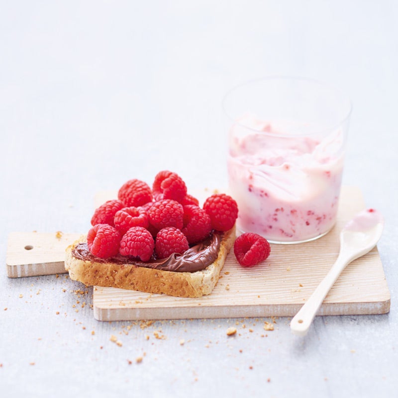 Grillez le pain et enduisez-le de la pâte à tartiner au chocolat, garnissez de framboises.