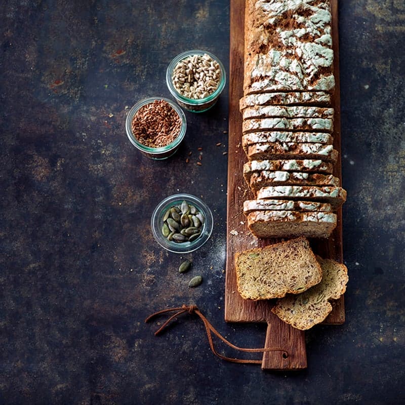 Préchauffez le four à 240 °C. Graissez un moule à pain (env. 30 cm de long) avec le beurre demiécrémé. Pétrissez à nouveau énergiquement la pâte. Ajoutez les graines (lin, tournesol et potiron) et mélangez encore. Déposez la pâte dans le moule et faites lever environ 60 minutes.