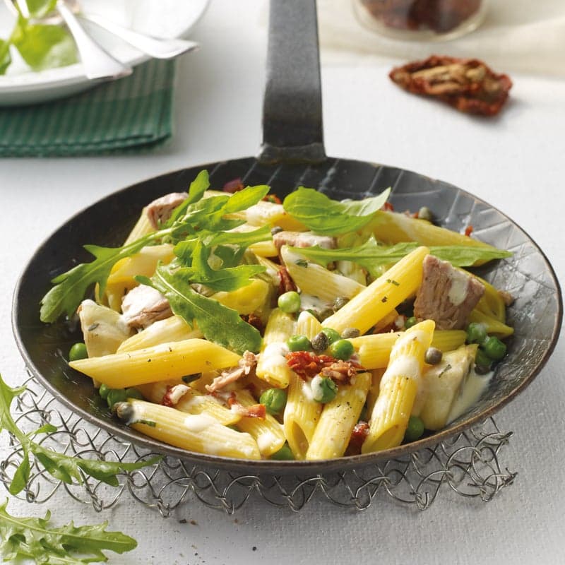 Cuire les penne à l’eau légèrement salée selon les instructions de l’emballage. 5 minutes avant la fin de la cuisson, ajouter les petits pois. Réhydrater les tomates séchées dans le bouillon chaud (± 10 minutes). Émincer l’oignon. Égoutter les coeurs d’artichaut et les couper en quatre. Égoutter le thon.
