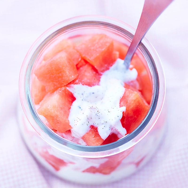 Mélangez le yaourt à la moelle du bâtonnet de vanille, ajoutez l'édulcorant et mélangez le tout avec les morceaux de melon.