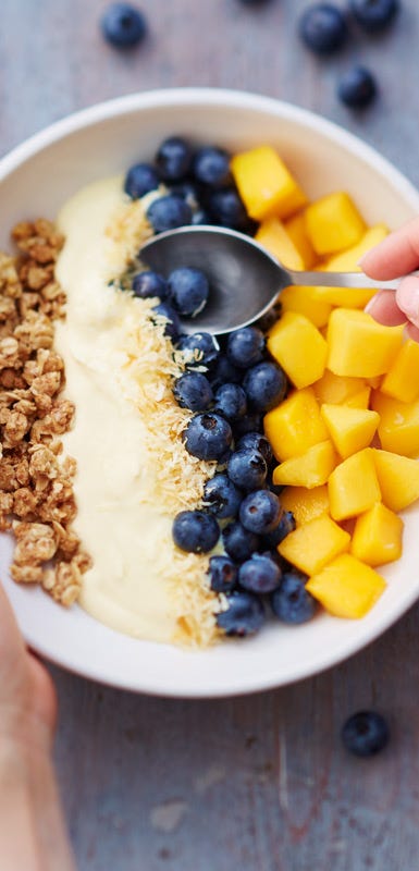 Net als bij een smoothie kies je ook hier gewoon voor je favoriete fruit, bijvoorbeeld mango. Een deel daarvan kan ook bevroren zijn als je het fruit pureert: zo krijgt de bowl een stevigere consistentie. Voor de topping kun je wat van het verse fruit apart houden.