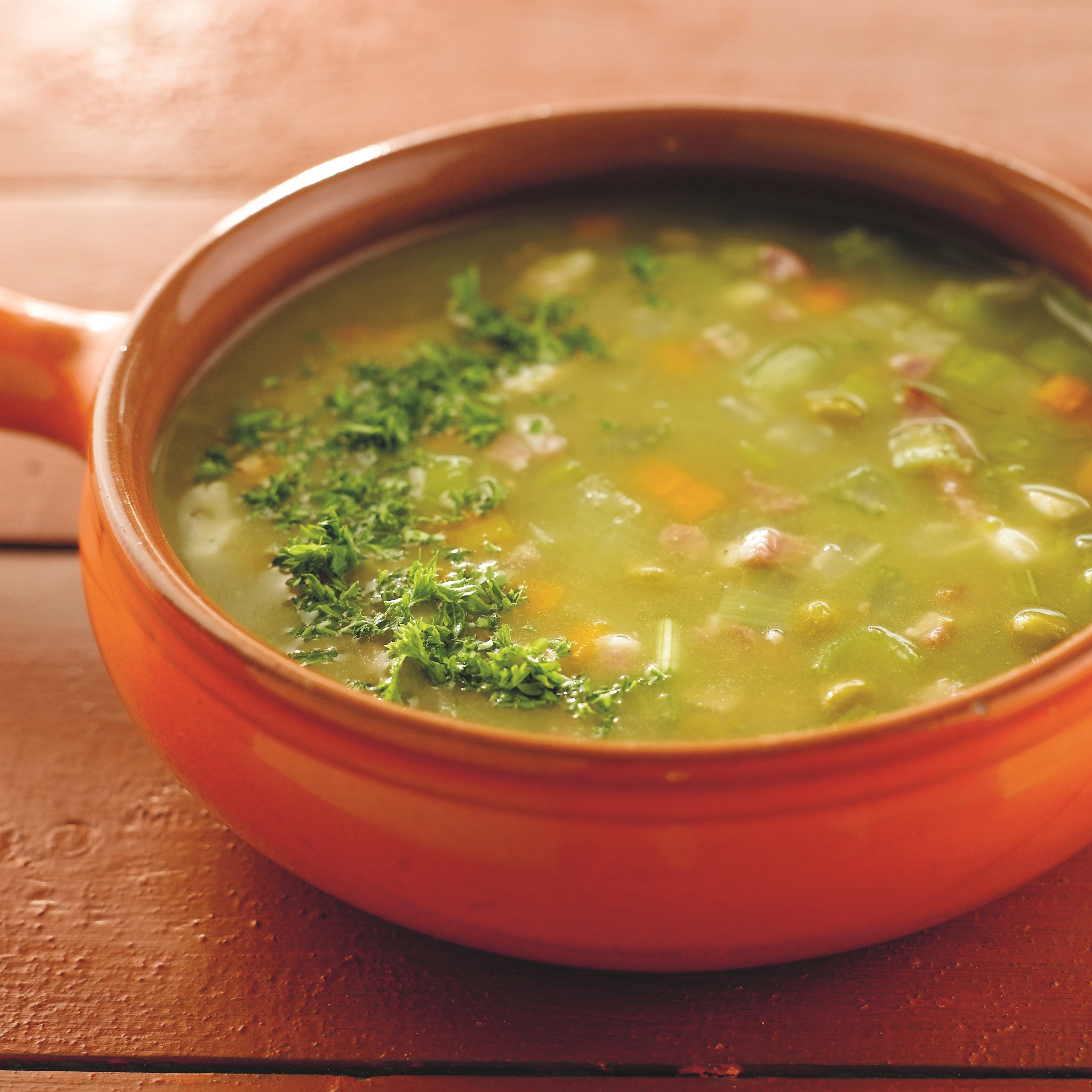 Neem het vlees uit de pan en giet de erwten door een zeef. Mix het kookvocht met de erwten tot een dikke soep.