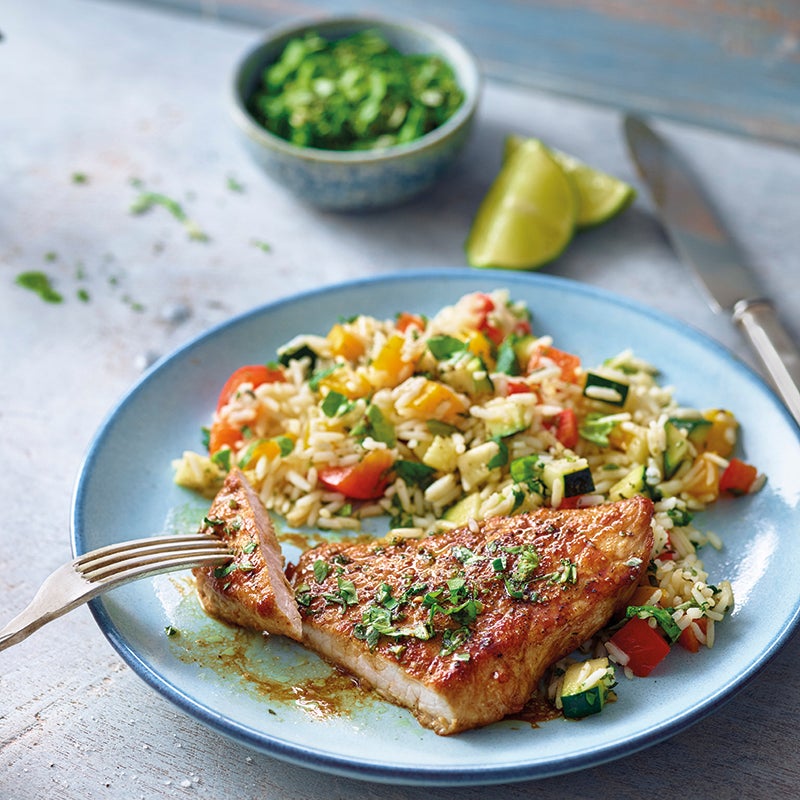 Verhit de rest van de olie in een pan op hoog vuur, bak de varkensfiletlapjes 4-5 minuten aan beide kanten en bestrooi met de rest van de kruiden. Breng de groenterijst op smaak met peper en zout en serveer met het vlees.