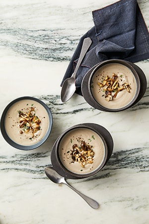 Pssst! Deze fluweelzachte, romige soep wil iets opbiechten. Er zit helemaal geen room en geen boter in, maar bloemkoolrijst uit de magnetron die is gepureerd met groentebouillon en gebakken paddenstoelen.