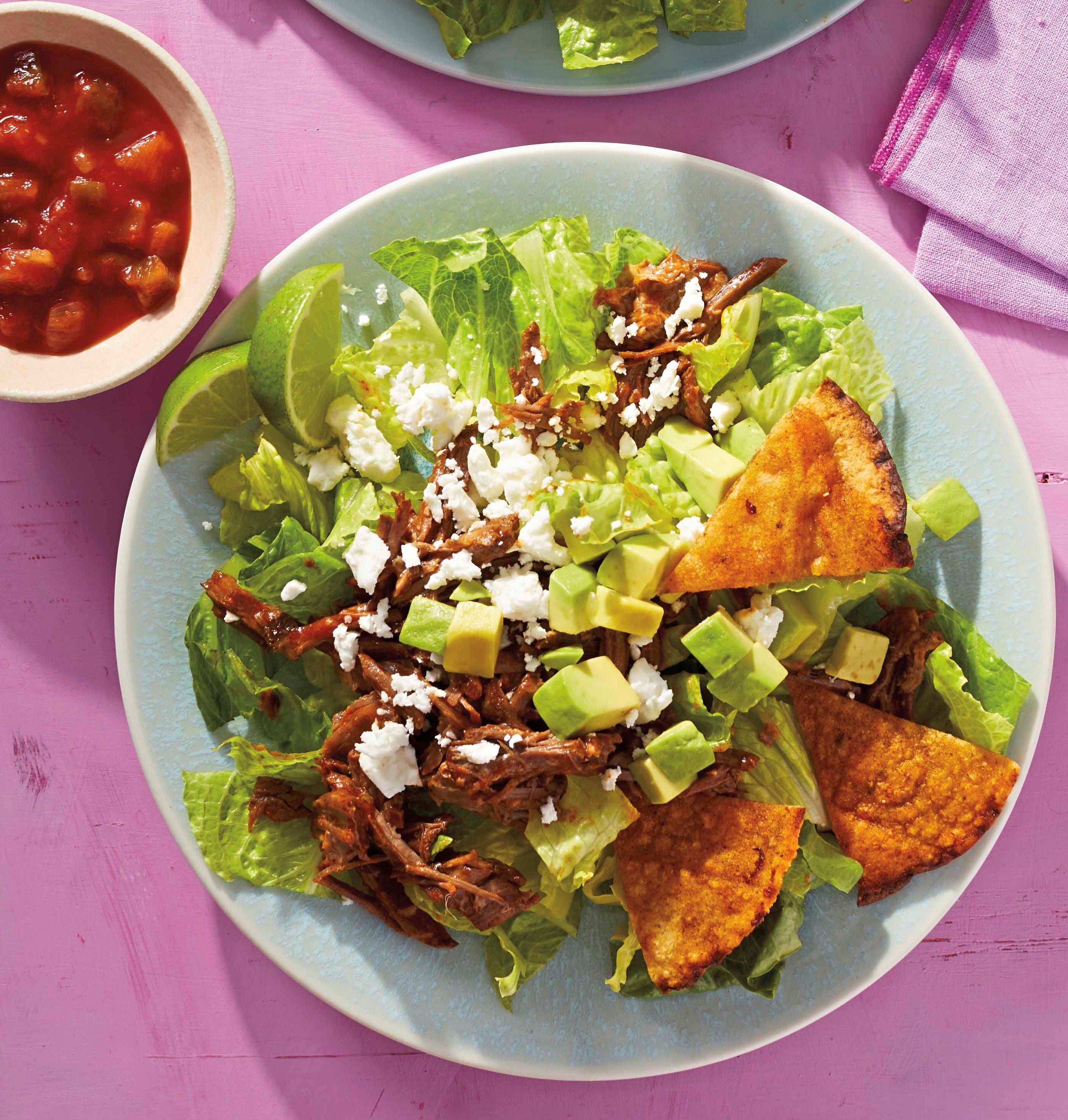 Birria taco's zijn tortilla's die zijn gevuld met gestoofd vlees, vervolgens in het smakelijke braadvocht worden gedoopt en tot slot worden gegrild totdat ze krokant zijn. We hebben hier een draai aan gegeven door er een salade van te maken. Houd de grill in de gaten zodat de tortilla's niet verbranden.