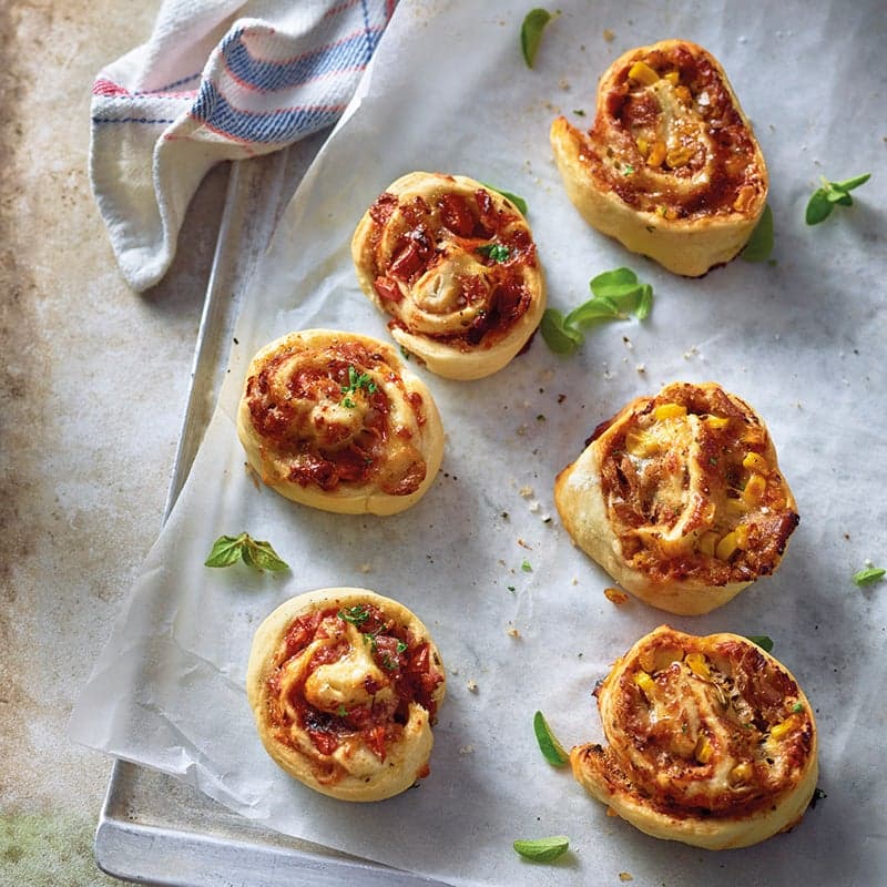 Meng een derde van de saus met blokjes tomaat, salami en 40 g kaas en bestrijk hiermee een deeghelft. Meng de rest van de saus met mais, tonijn en de rest van de kaas en bestrijk hiermee de andere deeghelft. Rol beide deeghelften vanaf de lange zijde op en snij elke helft in 8 plakken.