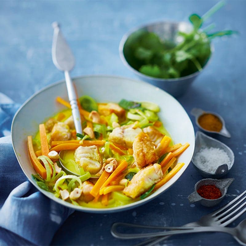 Meng de bloem met zout en wentel de vis erdoor. Verhit de olie in een pan, bak de vis ca. 4 minuten rondom en haal uit de pan. Bak de wortel en prei in de rest van het braadvocht. Bestrooi met peper en kerriepoeder en bak mee. Voeg de kokosmelk en de groentebouillon toe, breng aan de kook en laat ca. 5 minuten zachtjes koken.