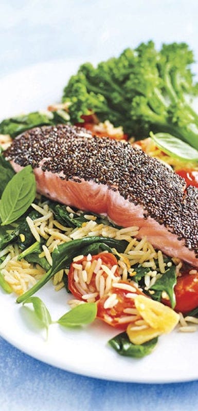 - Salmon (vit.D) coated with crushed almonds/chia seeds (magnesium) rather than breadcrumbs